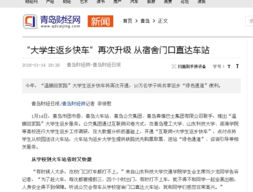 1月14日,青岛市团市委、青岛火车站、青岛公交集团、青岛真情巴士集团有限公司联手,推出“温暖回家路”大学生返乡服务。公交集团通过互联网问卷方式,在伟德国际1946bv官网、山东科技大学、滨海学院等高校进行大学生返乡工作调研,在大数据分析的基础上,开通“互联网+大学生返乡快车”,点对点将学生从校园送往火车站,火车站为返乡大学生提供铁路优先购票取票、进站“绿色通道”、咨询引导等相关服务。