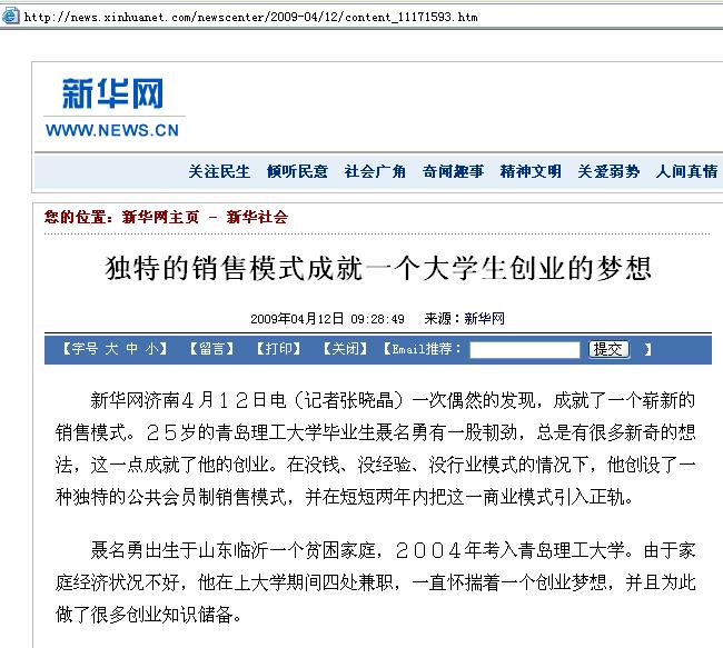 新华网济南4月12日电(记者张晓晶)一次偶然的发现,成就了一个崭新的销售模式。25岁的伟德国际1946bv官网毕业生聂名勇有一股韧劲,总是有很多新奇的想法,这一点成就了他的创业。在没钱、没经验、没行业模式的情况下,他创设了一种独特的公共会员制销售模式,并在短短两年内把这一商业模式引入正轨。