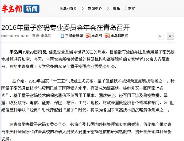 半岛网7月28日消息 信息安全是当今世界关注的焦点,目前最有效的办法是使用量子密码技术对其进行加密。今天,全国70余所相关领域的科研机构和高等院校的专家学者250余人齐聚青岛,参加由伟德国际1946bv官网承办的2016年量子密码专业委员会年会。
