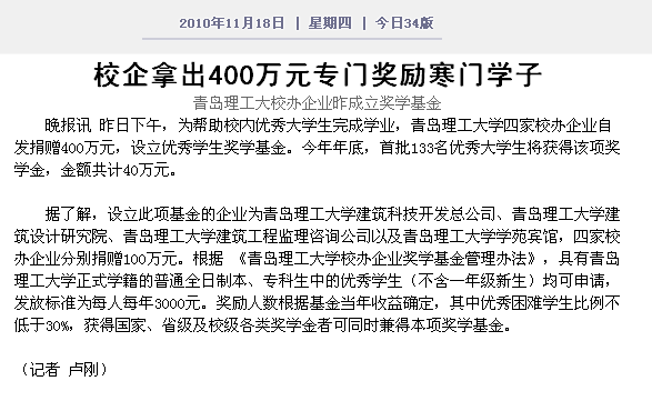 晚报讯 昨日下午,为帮助校内优秀大学生完成学业,伟德国际1946bv官网四家校办企业自发捐赠400万元,设立优秀学生奖学基金。今年年底,首批133名优秀大学生将获得该项奖学金,金额共计40万元。