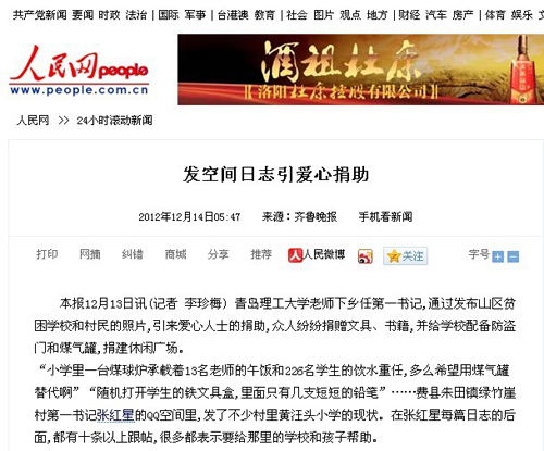 “小学里一台煤球炉承载着13名老师的午饭和226名学生的饮水重任,多么希望用煤气罐替代啊”“随机打开学生的铁文具盒,里面只有几支短短的铅笔”……费县朱田镇绿竹崖村第一书记张红星的QQ空间里,发了不少村里黄汪头小学的现状。在张红星每篇日志的后面,都有十条以上跟帖,很多都表示要给那里的学校和孩子帮助。