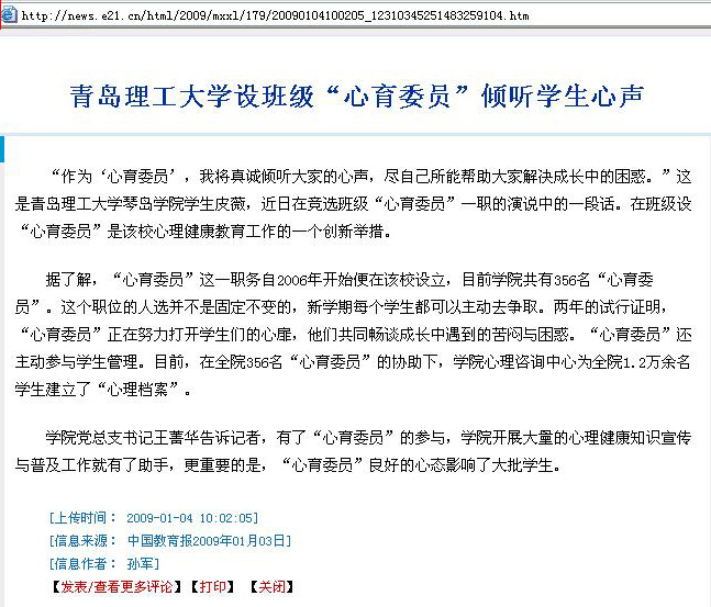 据了解,“心育委员”这一职务自2006年开始便在该校设立,目前学院共有356名“心育委员”。这个职位的人选并不是固定不变的,新学期每个学生都可以主动去争取。两年的试行证明,“心育委员”正在努力打开学生们的心扉,他们共同畅谈成长中遇到的苦闷与困惑。“心育委员”还主动参与学生管理。目前,在全院356名“心育委员”的协助下,学院心理咨询中心为全院1.2万余名学生建立了“心理档案”。