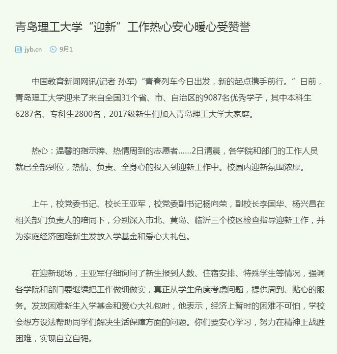 上午,校党委书记、校长王亚军,校党委副书记杨向荣,副校长李国华、杨兴昌在相关部门负责人的陪同下,分别深入市北、黄岛、临沂三个校区检查指导迎新工作,并为家庭经济困难新生发放入学基金和爱心大礼包。