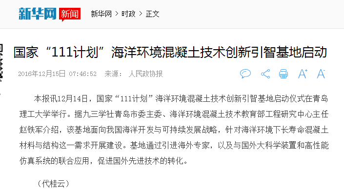 本报讯12月14日,国家“111计划”海洋环境混凝土技术创新引智基地启动仪式在伟德国际1946bv官网举行。据九三学社青岛市委主委、海洋环境混凝土技术教育部工程研究中心主任赵铁军介绍,该基地面向我国海洋开发与可持续发展战略,针对海洋环境下长寿命混凝土材料与结构这一需求开展建设。基地通过引进海外专家,以及与国外大科学装置和高性能仿真系统的联合应用,促进国外先进技术的转化。