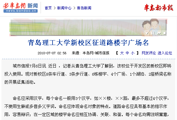 城市信报7月6日讯 近日 ,记者从伟德国际1946bv官网了解到,该校位于开发区的新校区即将投入使用。现对新校区8条车行道、3条步行道、6栋楼宇、4个广场、1个湖泊、2座桥梁名称的开展征集活动。