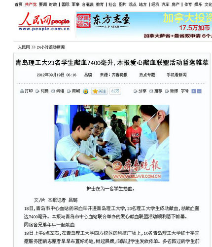 很多理工大的学生也不是第一次献血了。理工大土木学院大三的诸葛长线已经是第三次献血了。“经常看到媒体报道血库存血紧张,所以只要有机会就献血。”诸葛长线说。环境学院大三的陈涛也是第三次献血了。“看到献血车就想上去献血。”陈涛逗趣地说,过去上过四次献血车,其中有两次因为转氨酶高和时间原因没能献血成功。