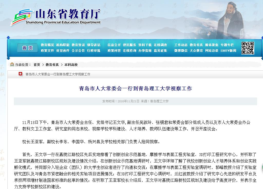 他指出,学校还要继续突出学科优势,提升教育教学质量。高校的根本任务是培养人才,教育教学始终是学校的中心工作,因此要牢固树立以学生为根本、教学为中心、人才培养为重点的高校教育观,加大课程建设和改革的力度,不断稳定规模,优化结构,强化特色,注重创新,走以质量提升为核心的内涵式发展道路。要加强协同创新,激发高校发展动力:一方面要加强内部的协同创新,持续深化校内综合改革,推动体制机制创新,打破制度壁垒,释放内生活力;另一方面要加强外部的协同创新,提高原始创新能力和引进消化吸收基础上的再创新能力,加快推进科技成果转移转化,更好地为地区和城市的创新发展提供人才支撑和智力支持。要注重人才培养,加强教师队伍建设:加强青年领军人才队伍建设,充分利用重大人才队伍建设项目,积极从海外引进一批青岛和高校急需的青年领军人才,并配套建立科学合理的学术评价机制,真正使人才引得进、留得下、用得好。大力加强对高校现有人才的培养,培养出更多的学科带头人、教学名师和学术骨干,建成一支良好的学术发展队伍。
