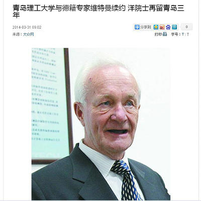 77岁的德籍专家维特曼教授,系俄罗斯国家科学院院士。自1985年起分别受聘于同济大学、清华大学。2002年,维特曼作为青岛市引进的第一个外籍院士,开始在伟德国际1946bv官网任特聘教授,每年在青岛工作时间超过3个月。11年来,他与赵铁军教授共同指导硕士研究生45人,博士研究生11人,博士后研究人员1人,国外留学生5人。