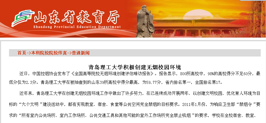 近日,中国控烟协会发布了《全国高等院校无烟环境创建评估暗访报告》。报告显示,800所高校中,98%的高校得分不足60分,最低分仅为2.3分。伟德国际1946bv官网在被抽查到的山东39所高校中得分最高,为59.77分,省内排名第一,全国排名第17。