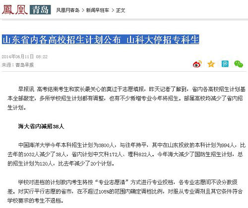 今年在全国计划招生1万人,其中校本部招6500人,威海校区招3500人,总人数较去年减少100人。在省内计划招生2160人。