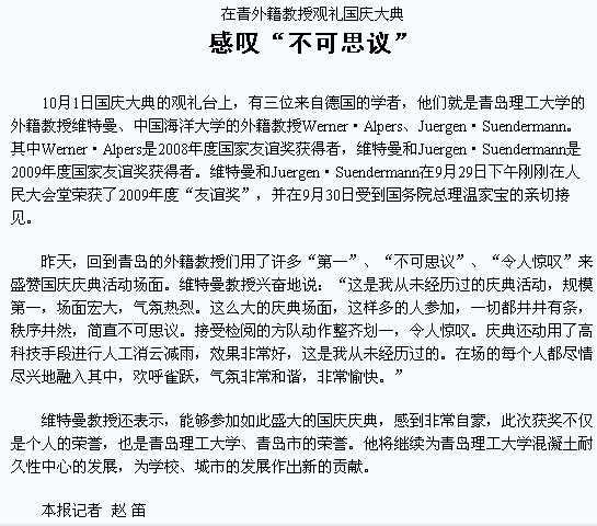 昨天,回到青岛的外籍教授们用了许多“第一”、“不可思议”、“令人惊叹”来盛赞国庆庆典活动场面。维特曼教授兴奋地说:“这是我从未经历过的庆典活动,规模第一,场面宏大,气氛热烈。这么大的庆典场面,这样多的人参加,一切都井井有条,秩序井然,简直不可思议。接受检阅的方队动作整齐划一,令人惊叹。庆典还动用了高科技手段进行人工消云减雨,效果非常好,这是我从未经历过的。在场的每个人都尽情尽兴地融入其中,欢呼雀跃,气氛非常和谐,非常愉快。”