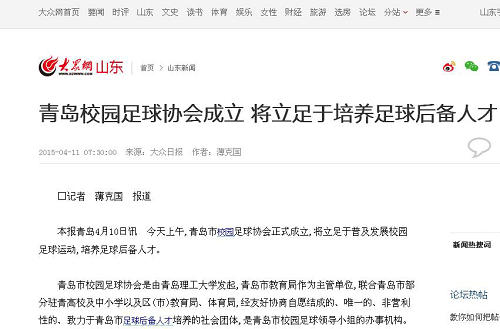 作为中国足协最早确定的校园足球试点城市之一,青岛“全国校园足球改革试验区”已申报成功,未来将建立四级联赛体系。