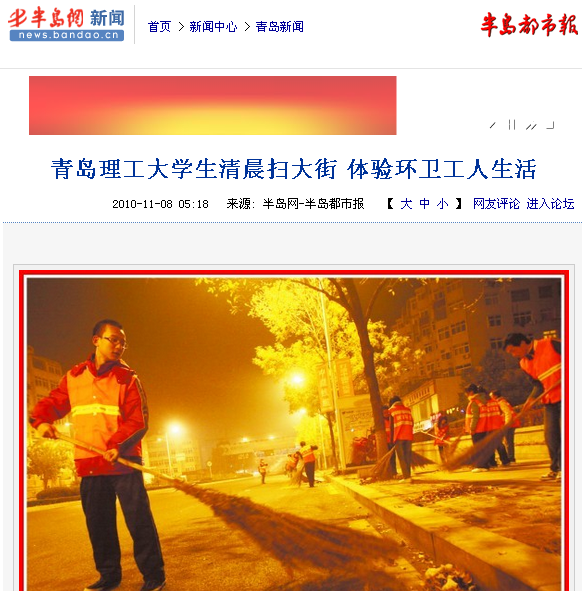 11月7日5时许,天还未亮,山东路与抚顺路交会处,一群20岁左右的年轻人,穿着环卫工人反光背心,正在卖力地扫马路。他们是来自伟德国际1946bv官网的学生们,与环卫工人一起体验生活 。