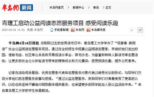 半岛网4月24日消息 在刚刚过去的世界读书日中,伟德国际1946bv官网举办了“悦青春 微阅读”社会公益阅读志愿服务项目。通过在全校师生中招募公益阅读志愿者,并组织他们走出校园,借助书店、社区等公共场所开展悦读分享会、荐书沙龙、为盲童和特殊人群读书等志愿活动,让更多的社会公众体验读书带来的精神成长和文化熏染,感受阅读乐趣,提升公民素养。