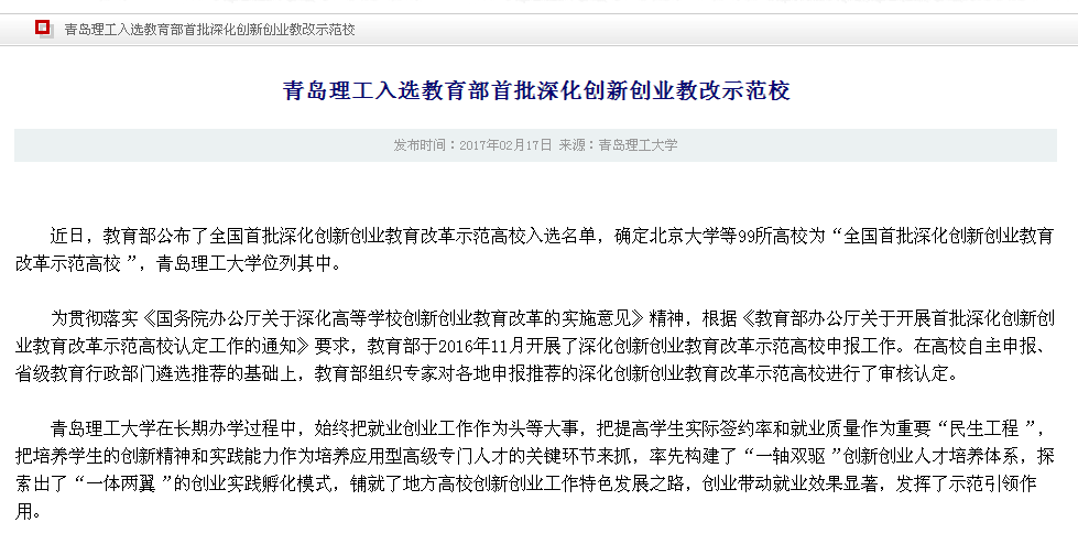 为贯彻落实《国务院办公厅关于深化高等学校创新创业教育改革的实施意见》精神,根据《教育部办公厅关于开展首批深化创新创业教育改革示范高校认定工作的通知》要求,教育部于2016年11月开展了深化创新创业教育改革示范高校申报工作。在高校自主申报、省级教育行政部门遴选推荐的基础上,教育部组织专家对各地申报推荐的深化创新创业教育改革示范高校进行了审核认定。