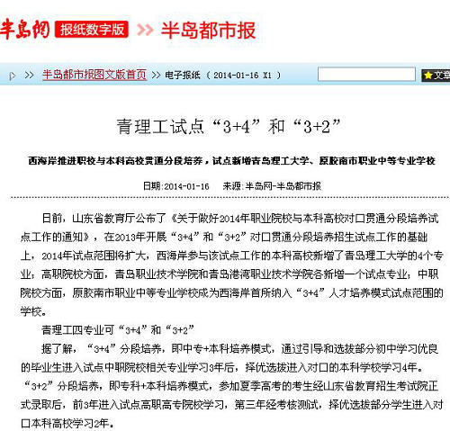 日前,山东省教育厅公布了《关于做好2014年职业院校与本科高校对口贯通分段培养试点工作的通知》,在2013年开展“3+4”和“3+2”对口贯通分段培养招生试点工作的基础上,2014年试点范围将扩大,西海岸参与该试点工作的本科高校新增了伟德国际1946bv官网的4个专业;高职院校方面,青岛职业技术学院和青岛港湾职业技术学院各新增一个试点专业;中职院校方面,原胶南市职业中等专业学校成为西海岸首所纳入“3+4”人才培养模式试点范围的学校。