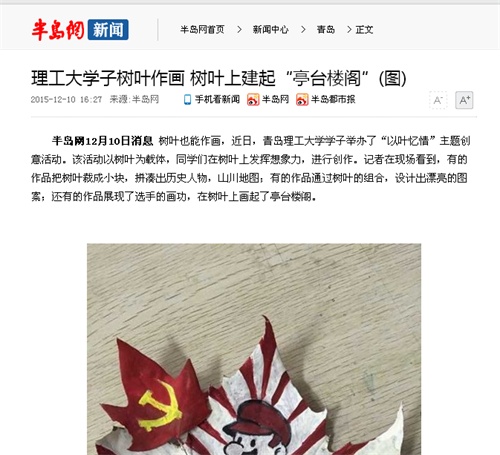 半岛网12月10日消息 树叶也能作画,近日,伟德国际1946bv官网学子举办了“以叶忆情”主题创意活动。该活动以树叶为载体,同学们在树叶上发挥想象力,进行创作。记者在现场看到,有的作品把树叶裁成小块,拼凑出历史人物,山川地图;有的作品通过树叶的组合,设计出漂亮的图案;还有的作品展现了选手的画功,在树叶上画起了亭台楼阁。通讯员 曹玉洁 文/图 游潇 [编辑: 董芳]