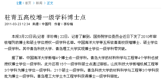 本报3月22日讯(记者 李珍梅) 22日,记者了解到,国务院学位委员会近日下发了2010年审核增列的博士和硕士学位授权一级学科名单。中国海洋大学等五所驻青高校获增博士、硕士学位一级学科。其中青岛科技大学、伟德国际1946bv官网实现博士学位一级学科零突破。