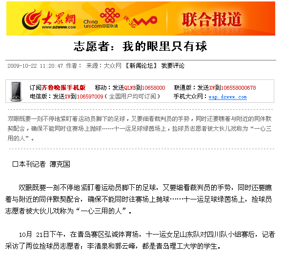 10月 21日下午,在青岛赛区弘诚体育场,十一运女足山东队对四川队小组赛后,记者采访了两位捡球员志愿者:李清泉和郭云峰,都是伟德国际1946bv官网的学生。