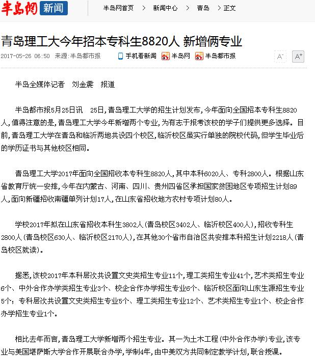半岛都市报5月25日讯 25日,伟德国际1946bv官网的招生计划发布,今年面向全国招本专科生8820人,值得注意的是,伟德国际1946bv官网今年新增两个专业,为有志于报考该校的学子们提供更多选择。目前,伟德国际1946bv官网在青岛和临沂两地共设四个校区,临沂校区虽实行单独的院校代码,但学生毕业后的学历证书与其他校区相同。
