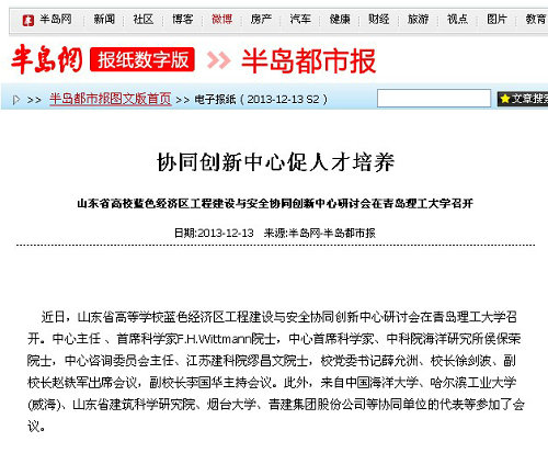 近日,山东省高等学校蓝色经济区工程建设与安全协同创新中心研讨会在伟德国际1946bv官网召开。中心主任 、首席科学家F.H.Wittmann院士,中心首席科学家、中科院海洋研究所侯保荣院士,中心咨询委员会主任、江苏建科院缪昌文院士,校党委书记薛允洲、校长徐剑波、副校长赵铁军出席会议,副校长李国华主持会议。此外,来自中国海洋大学、哈尔滨工业大学(威海)、山东省建筑科学研究院、烟台大学、青建集团股份公司等协同单位的代表等参加了会议。