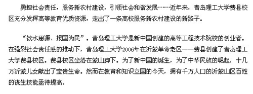 勇担社会责任,服务新农村建设,引领社会和谐发展……近年来,伟德国际1946bv官网费县校区充分发挥高等教育优质资源,走出了一条高校服务新农村建设的新路子。