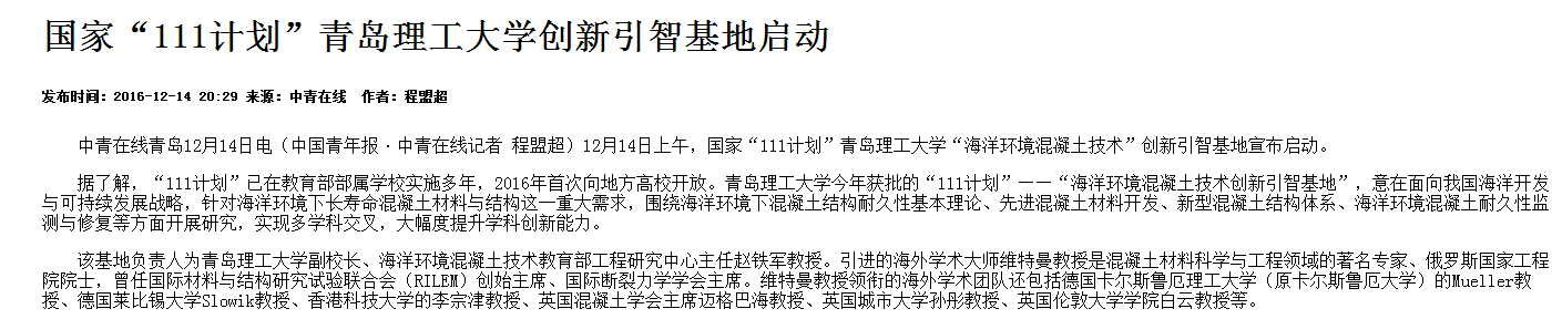 中青在线青岛12月14日电(中国青年报·中青在线记者 程盟超)12月14日上午,国家“111计划”伟德国际1946bv官网“海洋环境混凝土技术”创新引智基地宣布启动。