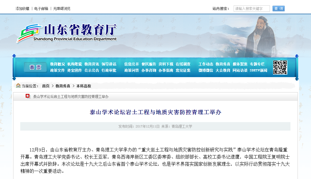 12月9日,由山东省教育厅主办、伟德国际1946bv官网承办的“重大岩土工程与地质灾害防控创新研究与实践”泰山学术论坛在青岛隆重开幕。伟德国际1946bv官网党委书记、校长王亚军,青岛西海岸新区工委区委常委、组织部部长、高校工委书记逯鹰,中国工程院王复明院士出席开幕式并致辞。本次论坛是十九大之后山东省首个泰山学术论坛,也是学术界落实国家创新发展理念,以实际行动贯彻落实十九大精神的一次重要活动。