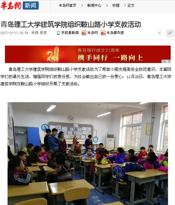 伟德国际1946bv官网建筑学院组织鞍山路小学支教活动为了帮助小朋友提高安全防范意识,丰富同学们的课外生活,增强同学们的责任感,为社会献出自己的一份爱心,11月29日,伟德国际1946bv官网建筑学院在鞍山路小学组织开展了支教活动。