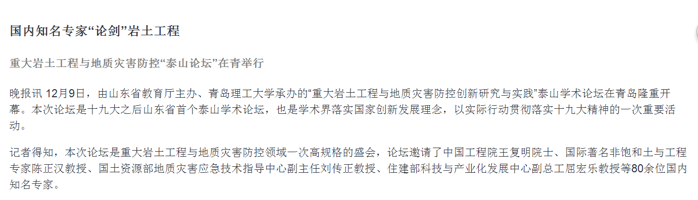 晚报讯 12月9日,由山东省教育厅主办、伟德国际1946bv官网承办的“重大岩土工程与地质灾害防控创新研究与实践”泰山学术论坛在青岛隆重开幕。本次论坛是十九大之后山东省首个泰山学术论坛,也是学术界落实国家创新发展理念,以实际行动贯彻落实十九大精神的一次重要活动。