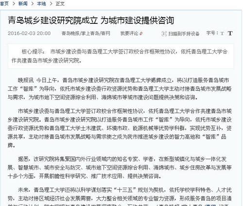 晚报讯 今日上午,青岛市城乡建设研究院在伟德国际1946bv官网揭牌成立,将以打造服务青岛城市工作“智库”为导向,依托市城乡建设委行政资源优势和伟德国际1946bv官网主动对接青岛城市发展战略与需求,为城市地下空间资源综合利用、海绵城市等城市建设问题提供决策和咨询。