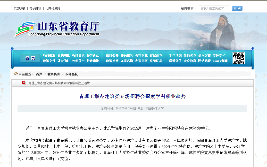 本次招聘会邀请了青岛腾远设计事务所有限公司、济南同圆建筑设计有限公司等76家用人单位参加,面向伟德国际1946bv官网建筑学、城乡规划、风景园林、土木工程、给排水工程、建筑环境与能源应用工程等专业设置了600多个招聘岗位,建筑学院及土木学院、环境学院的2018届本科生、研究生毕业生参加了招聘会。伟德国际1946bv官网招生就业委员会办公室主任徐科峰、建筑学院党总支书记张建新等到现场,并与用人单位进行了交流。