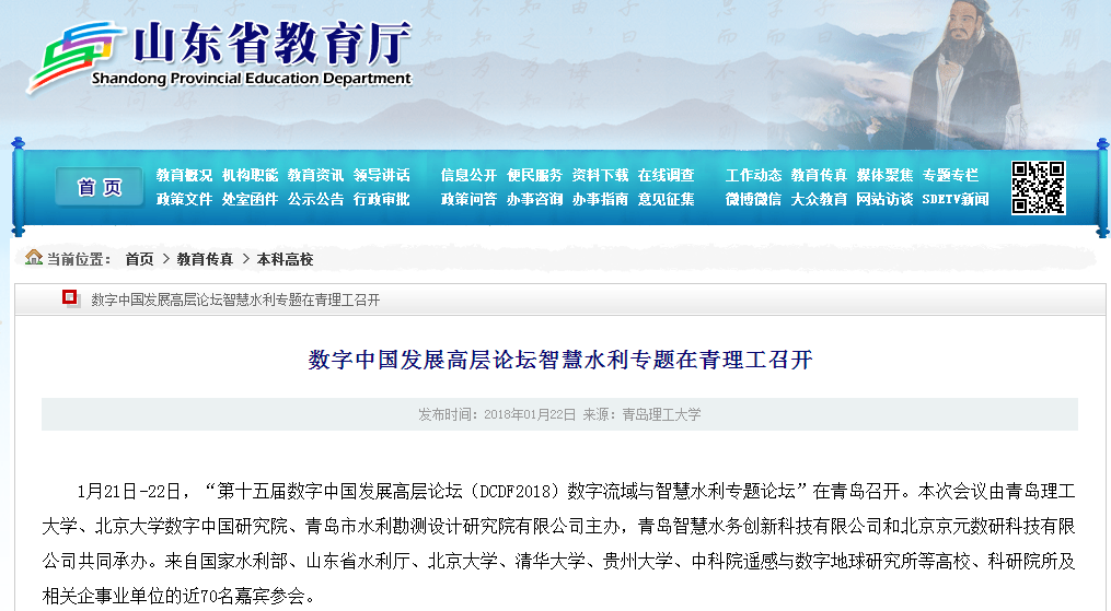 1月21日-22日,“第十五届数字中国发展高层论坛(DCDF2018)数字流域与智慧水利专题论坛”在青岛召开。本次会议由伟德国际1946bv官网、北京大学数字中国研究院、青岛市水利勘测设计研究院有限公司主办,青岛智慧水务创新科技有限公司和北京京元数研科技有限公司共同承办。来自国家水利部、山东省水利厅、北京大学、清华大学、贵州大学、中科院遥感与数字地球研究所等高校、科研院所及相关企事业单位的近70名嘉宾参会。
