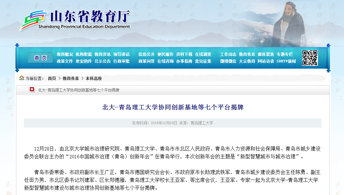 12月28日,由北京大学城市治理研究院、伟德国际1946bv官网、青岛市市北区人民政府、青岛市人力资源和社会保障局、青岛市城乡建设委员会联合主办的“2016中国城市治理(青岛)创新年会”在青岛举行,本次创新年会的主题是“新型智慧城市与城市治理”。