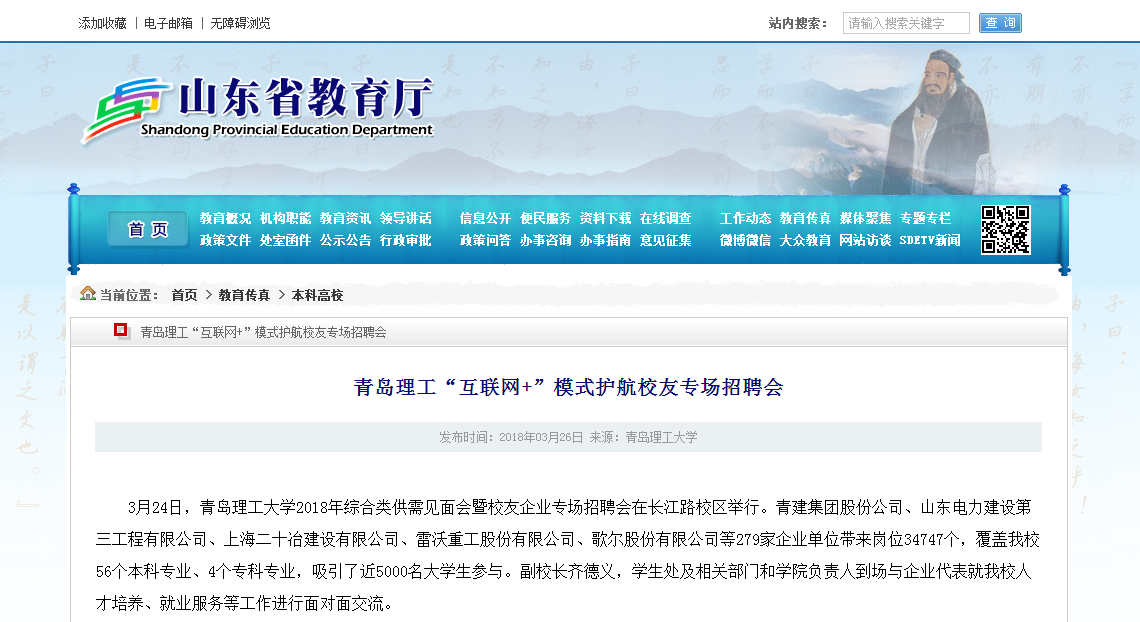 3月24日,伟德国际1946bv官网2018年综合类供需见面会暨校友企业专场招聘会在长江路校区举行。青建集团股份公司、山东电力建设第三工程有限公司、上海二十冶建设有限公司、雷沃重工股份有限公司、歌尔股份有限公司等279家企业单位带来岗位34747个,覆盖伟德官网56个本科专业、4个专科专业,吸引了近5000名大学生参与。副校长齐德义,学生处及相关部门和学院负责人到场与企业代表就伟德官网人才培养、就业服务等工作进行面对面交流。