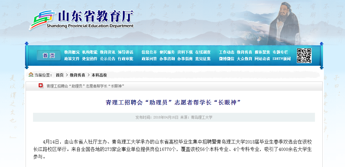 4月14日,由山东省人社厅主办、伟德国际1946bv官网承办的山东省高校毕业生集中招聘暨伟德国际1946bv官网2018届毕业生春季双选会在该校长江路校区举行。来自全国各地的273家企事业单位提供岗位16770个,覆盖该校56个本科专业、4个专科专业,吸引了4000余名大学生参与。