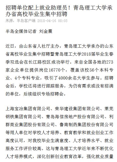 近日,由山东省人社厅主办,伟德国际1946bv官网承办的山东省高校毕业生集中招聘暨伟德国际1946bv官网2018届毕业生春季双选会在长江路校区成功举行。来自全国各地的273家企业单位提供岗位16770个,覆盖该校56个本科专业、4个专科专业,吸引了4000余名大学生参与。招聘会后,学校还将进行跟踪服务,为仍有需求或没有招满的单位,后续组织专场招聘会。