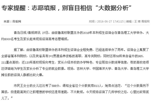 据伟德国际1946bv官网招生科老师杜方介绍,当前社会上有不少咨询公司将往年的分数进行综合大数据分析之后,向考生及家长兜售所谓的“报考指导”,有的考生和家长因盲信儿盲从,“实际上,今年的高考情况与往年变化很大,一方面虽然全省增加了不少招生计划,但各个学校的调整差别很大,另一方面今年考生的分数段分布不均,单纯根据往年的大数据分析不是很靠谱。”杜方表示,利用自己高考成绩所对应的省(市)位次,结合各校各专业的预估分数线,把握会更大一些。
