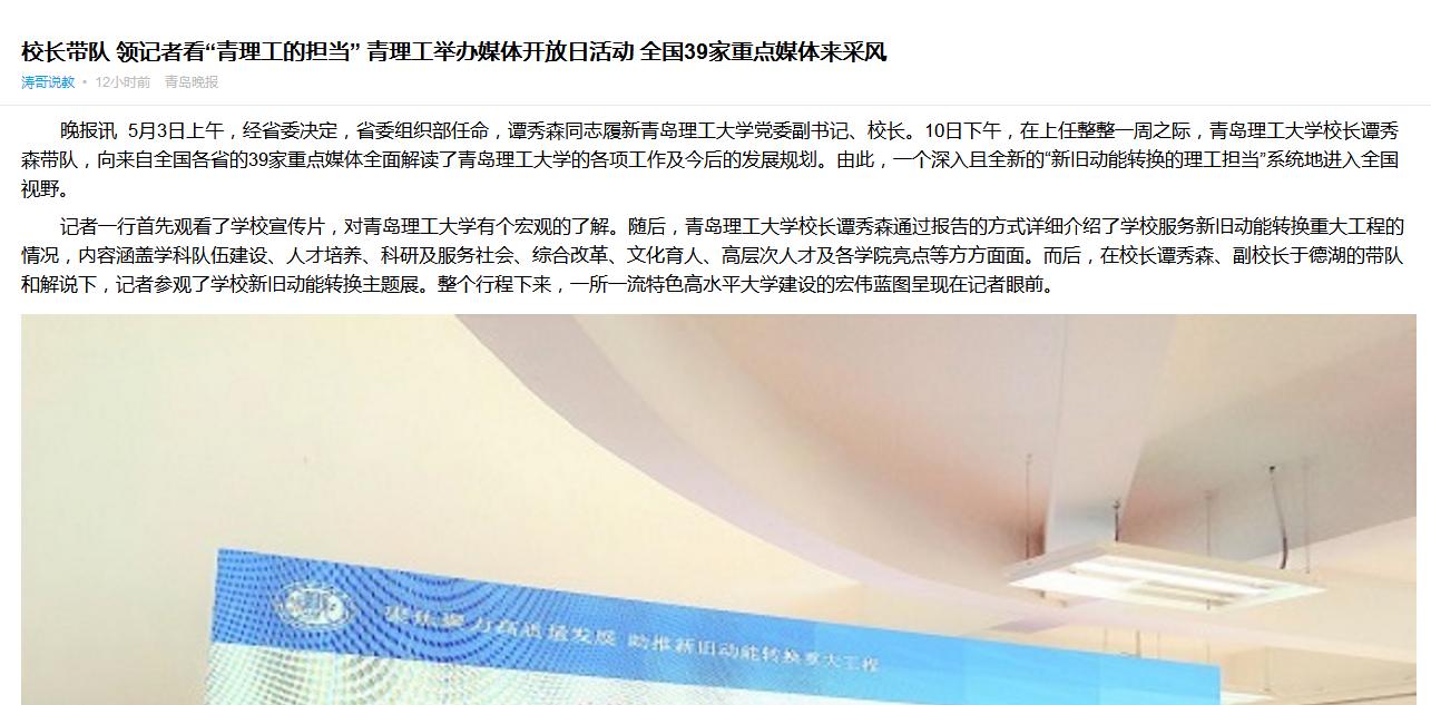 此次伟德国际1946bv官网由校长亲自带队对全国范围的重点媒体开放,在各高校中较为罕见,来自中央及各省的主流媒体记者均认为这是对“新旧动能转换的理工担当“的自信和最好表达。(青岛晚报/掌上青岛/青网 记者 杨海涛 通讯员 曹玉洁)
