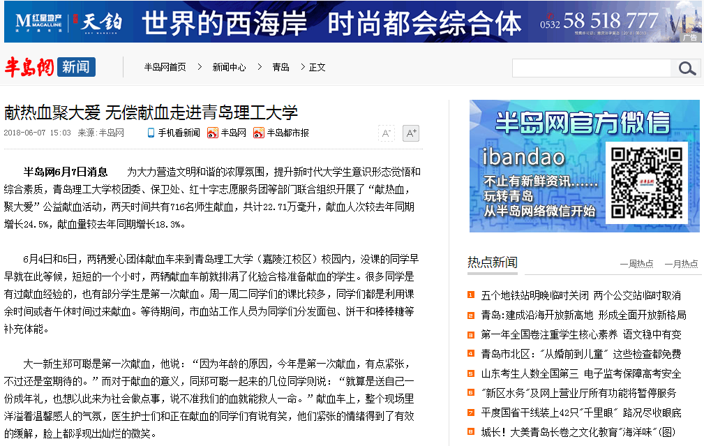 半岛网6月7日消息 为大力营造文明和谐的浓厚氛围,提升新时代大学生意识形态觉悟和综合素质,伟德国际1946bv官网校团委、保卫处、红十字志愿服务团等部门联合组织开展了“献热血,聚大爱”公益献血活动,两天时间共有716名师生献血,共计22.71万毫升,献血人次较去年同期增长24.5%,献血量较去年同期增长18.3%。