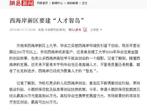 “人才始终是核心竞争力,我们西海岸有自己的‘智岛计划’,加快各类人才集聚,提升人才引进培育的质与量。”黄岛区人社局工作人员告诉记者,2013年,西海岸启动了“智岛计划”,结合区划调整实际,将“智岛计划”引才目标调整为“利用5年左右时间,引进培育30名顶尖人才、300名领军人才、3000名紧缺人才,带动集聚15万名大学生和专业技术人才就业创业”。同时,出台相关配套政策,如规定顶尖人才、领军人才、紧缺人才3年内分别享受100万元、20万元和6万元安家补贴,年收入12万元以上的,按其经济贡献给予为期3年,每年最高30万元的奖励资金等,为高层次人才引进提供核心政策支撑。