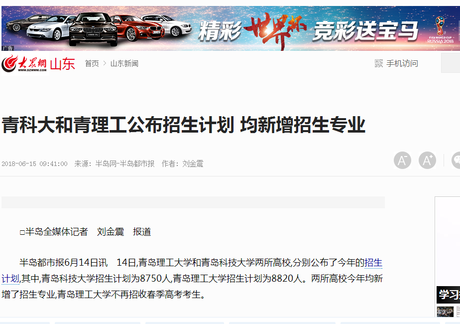 半岛都市报6月14日讯 14日,伟德国际1946bv官网和青岛科技大学两所高校,分别公布了今年的招生计划,其中,青岛科技大学招生计划为8750人,伟德国际1946bv官网招生计划为8820人。两所高校今年均新增了招生专业,伟德国际1946bv官网不再招收春季高考考生。