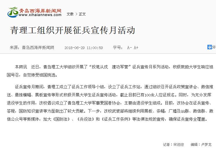 征兵宣传月期间,青理工成立了征兵工作领导小组,设立了征兵工作站,通过组织召开征兵政策宣讲会、微信推送、悬挂横幅、展板宣传等形式积极开展大学生征兵宣传活动,截止目前已有100余人应征报名。同时,为充分发挥退役学生的作用,该校倡议成立了伟德国际1946bv官网军事爱国者协会,主要由退役学生组成。目前,该协会在征兵宣传、答疑,国防知识宣讲等方面做出了较大贡献。下一步,该校武装部将继续利用展板、条幅,广播及QQ群、微信群、微信公众号等新媒体,加大《国防法》、《兵役法》和《征兵工作条例》等法律法规的宣传,确保征兵宣传全覆盖。