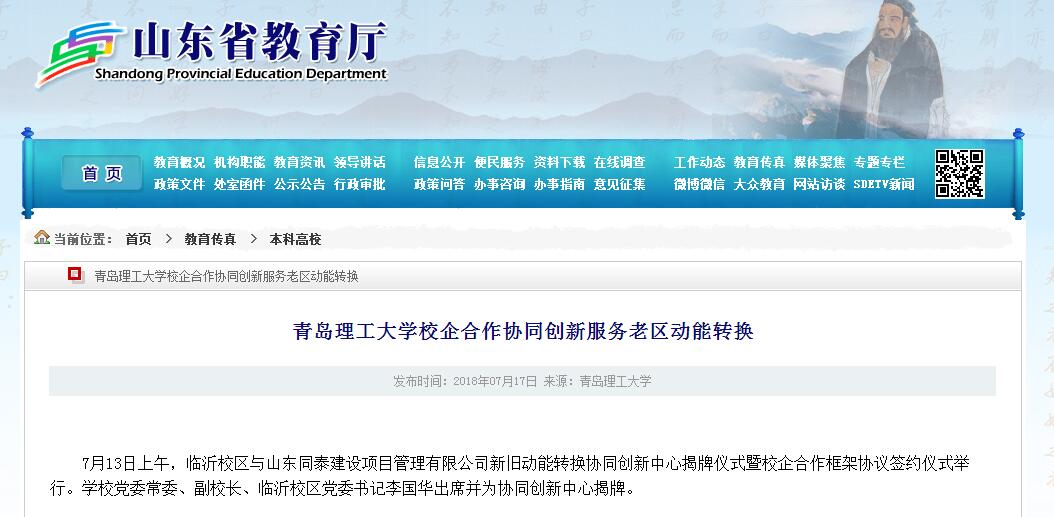 7月13日上午,临沂校区与山东同泰建设项目管理有限公司新旧动能转换协同创新中心揭牌仪式暨校企合作框架协议签约仪式举行。学校党委常委、副校长、临沂校区党委书记李国华出席并为协同创新中心揭牌。