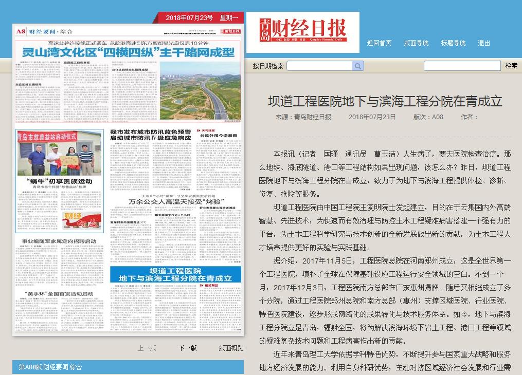 据介绍,2017年11月5日,工程医院总院在河南郑州成立,这是全世界第一个工程医院,填补了全球在保障基础设施工程运行安全领域的空白。不到一个月,2017年12月3日,工程医院南方总部在广东惠州揭牌。随后又相继成立了多个分院,通过工程医院郑州总院和南方总部(惠州)支撑区域医院、行业医院、特色医院建设,逐步形成网络化的成果转化与技术服务体系。如今,地下与滨海工程分院立足青岛,辐射全国,将为解决滨海环境下岩土工程、港口工程等领域的疑难复杂技术问题和工程病害作出新的贡献。