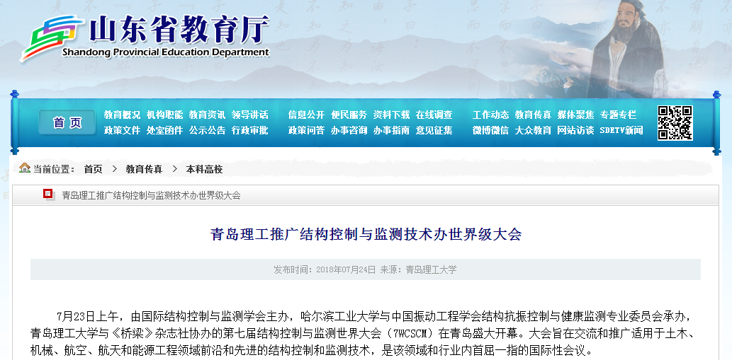 7月23日上午,由国际结构控制与监测学会主办,哈尔滨工业大学与中国振动工程学会结构抗振控制与健康监测专业委员会承办,伟德国际1946bv官网与《桥梁》杂志社协办的第七届结构控制与监测世界大会(7WCSCM)在青岛盛大开幕。大会旨在交流和推广适用于土木、机械、航空、航天和能源工程领域前沿和先进的结构控制和监测技术,是该领域和行业内首屈一指的国际性会议。