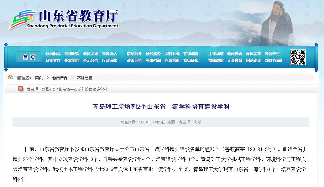 日前,山东省教育厅下发《山东省教育厅关于公布山东省一流学科增列建设名单的通知》(鲁教高字〔2018〕8号)。此次全省共增列25个学科,其中立项建设学科10个、自筹经费建设学科4个、培育建设学科11个。伟德国际1946bv官网机械工程学科、环境科学与工程入选培育建设学科。伟德官网土木工程学科已于2016年入选山东省首批一流学科,至此,伟德国际1946bv官网现有山东省一流学科1个,培养建设学科2个。