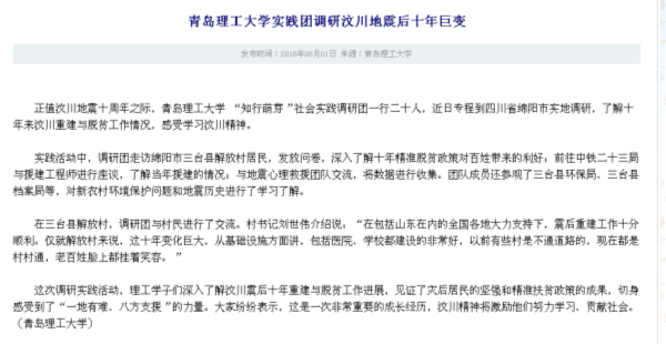 这次调研实践活动,理工学子们深入了解汶川震后十年重建与脱贫工作进展,见证了灾后居民的坚强和精准扶贫政策的成果,切身感受到了“一地有难、八方支援”的力量。大家纷纷表示,这是一次非常重要的成长经历,汶川精神将激励他们努力学习、贡献社会。(伟德国际1946bv官网)