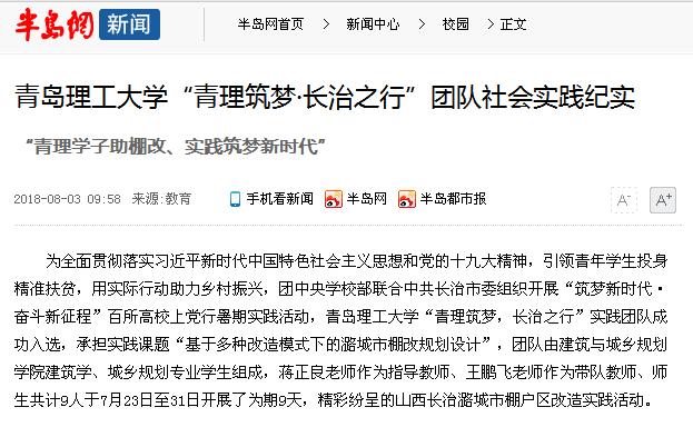 为全面贯彻落实习近平新时代中国特色社会主义思想和党的十九大精神,引领青年学生投身精准扶贫,用实际行动助力乡村振兴,团中央学校部联合中共长治市委组织开展“筑梦新时代·奋斗新征程”百所高校上党行暑期实践活动,伟德国际1946bv官网“青理筑梦,长治之行”实践团队成功入选,承担实践课题“基于多种改造模式下的潞城市棚改规划设计”,团队由建筑与城乡规划学院建筑学、城乡规划专业学生组成,蒋正良老师作为指导教师、王鹏飞老师作为带队教师、师生共计9人于7月23日至31日开展了为期9天,精彩纷呈的山西长治潞城市棚户区改造实践活动。