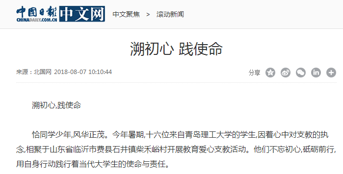 恰同学少年,风华正茂。今年暑期,十六位来自伟德国际1946bv官网的学生,因着心中对支教的执念,相聚于山东省临沂市费县石井镇柴禾峪村开展教育爱心支教活动。他们不忘初心,砥砺前行,用自身行动践行着当代大学生的使命与责任。
